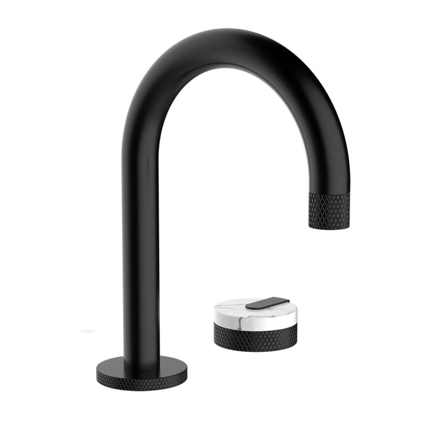 Finish your bathroom to create a modern luxury space with Fino Stone bathroom accessories. They are perfect for a high end designer bathrooms or five star hotels. This beautiful shelf mounted tap in matt black features a unique single white marble handle and is perfect for a marble or white stone bathroom.