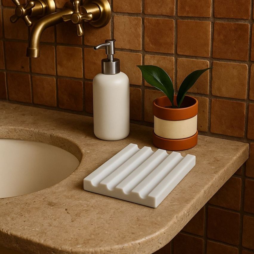 The Fino Stone Diago matt white stone soap dish is a refined fusion of elegance and craftsmanship, designed to bring a touch of luxury to any bathroom. Sculpted from premium solid surface stone, its flawless matte white finish is beautifully accented by a subtle, stylish grey marble vein, creating a timeless and sophisticated aesthetic. The sleek, geometric form is both visually striking and highly functional, providing a perfect resting place for your finest soaps. Durable, moisture-resistant, and effortlessly chic, the Diago soap dish is more than just an accessory, it is a statement of exquisite design and superior quality.