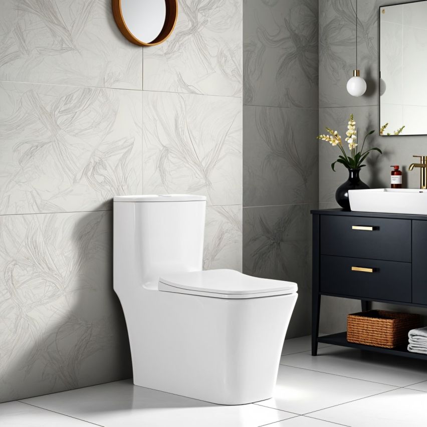 A modern WC, the Fino Stone floor standing toilet offers a stylish single piece design that looks better and is more hygienic than the separate base and back units. Crafted from premium ceramic with a flawlessly smooth finish, this elegantly streamlined toilet brings a refined, architectural aesthetic to contemporary bathrooms. Its rimless technology ensures superior hygiene and effortless maintenance, while the soft-close seat adds a touch of quiet luxury. Designed for those who demand both beauty and exceptional craftsmanship.